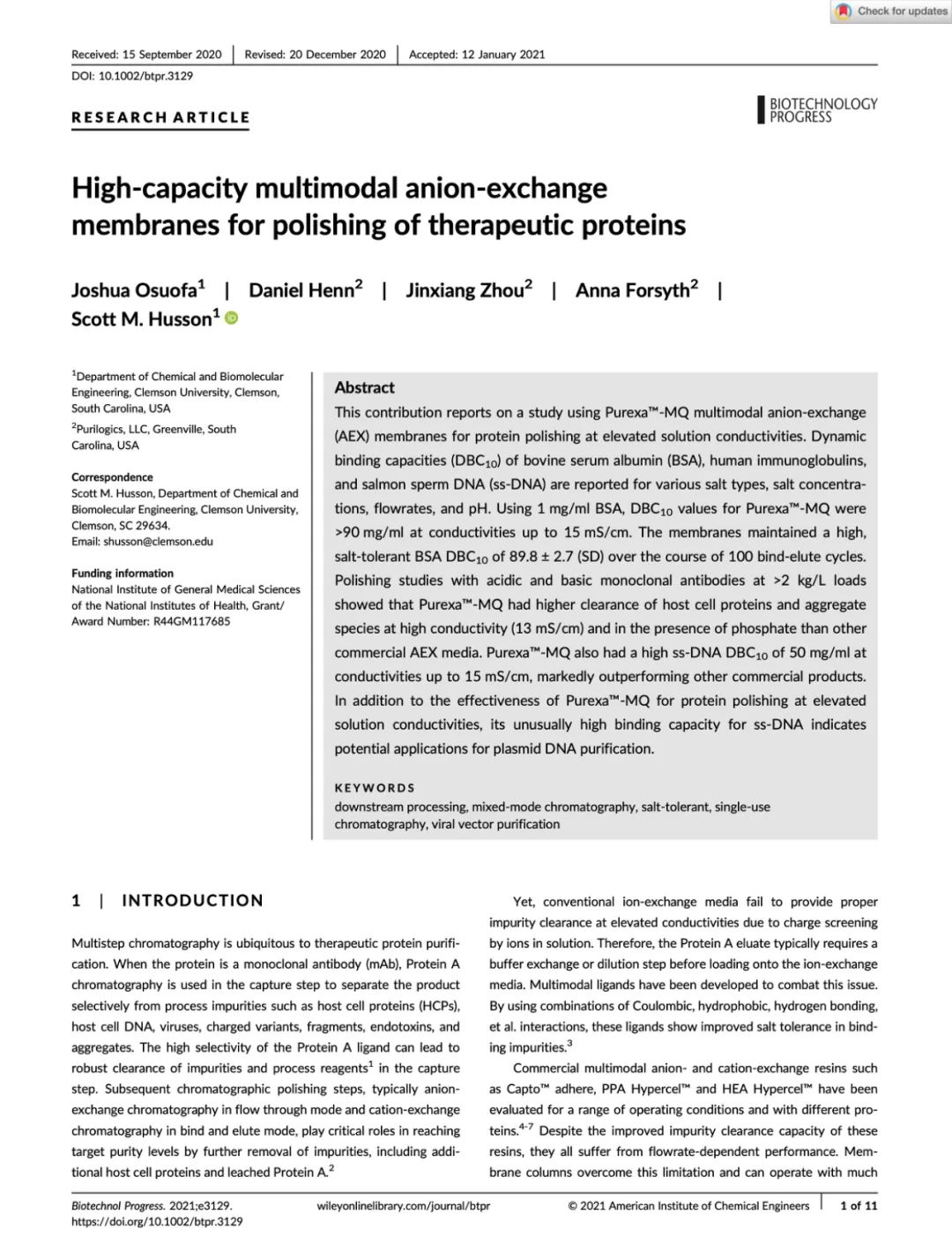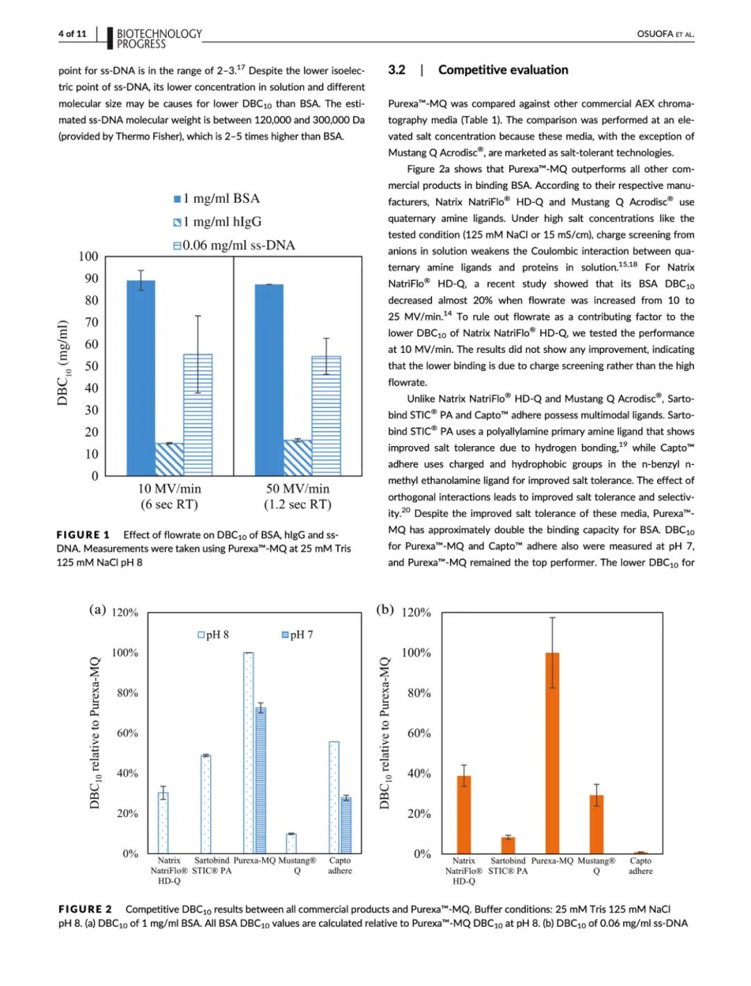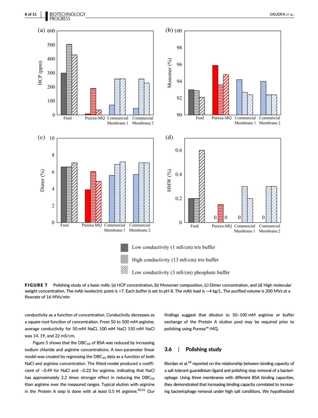 这项研究表明,Purexa MQ膜是一种有价值的高通量选择,可在一系列(不同)电导率的条件下上清除生物工艺杂质。Purexa MQ膜在生物工艺系列中的应用可以通过减少处理步骤的数量和缓冲液的使用来提高工艺效率和产量。另目前亦有很多公司应用该膜来进行质粒(基因治疗领域)的纯化,均取得了突破性的效果。