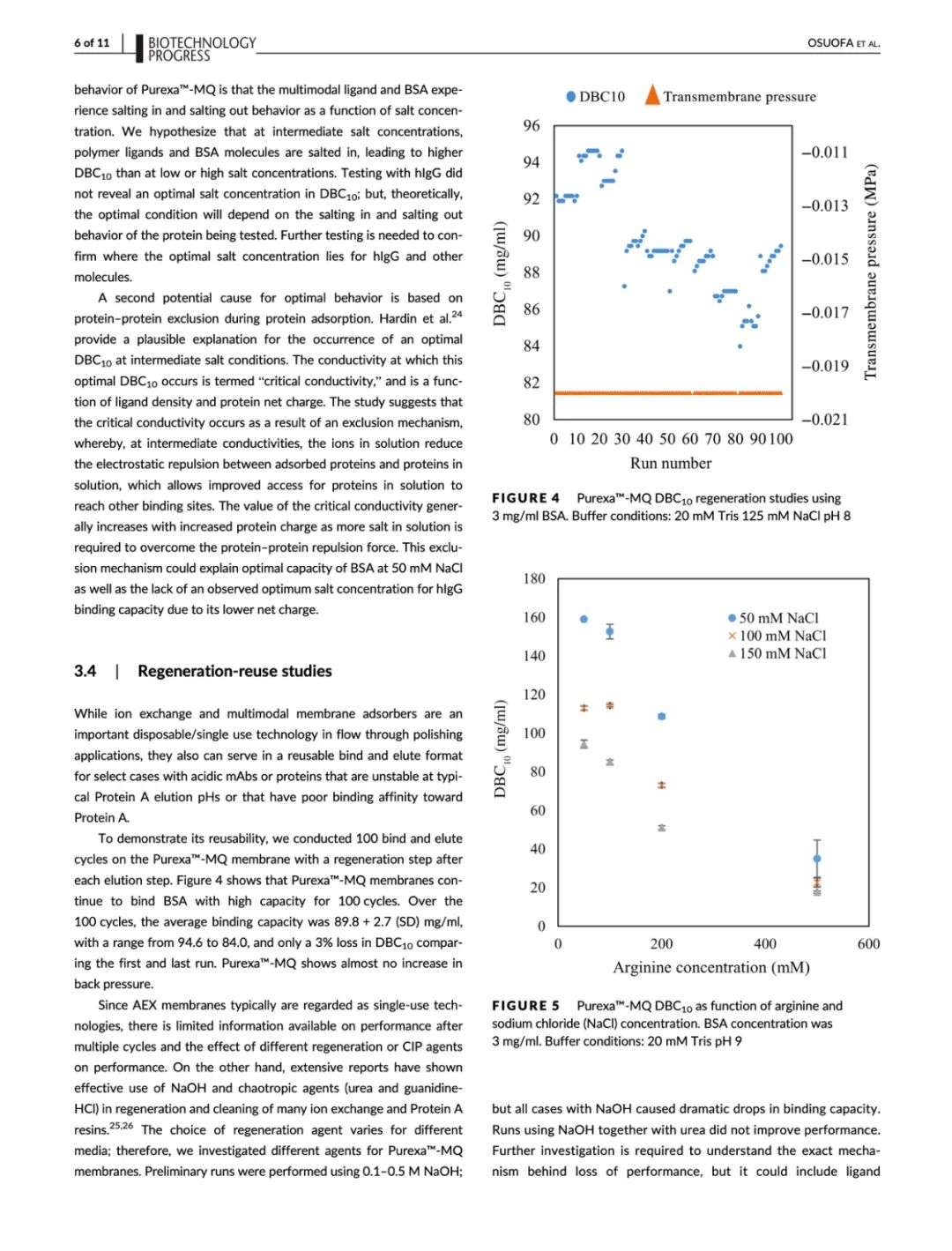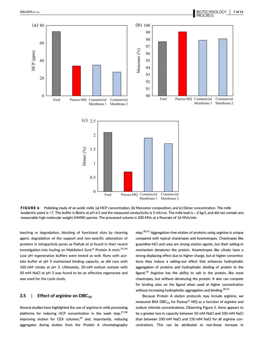 本研究评估了Purexa MQ,一种新多模式AEX膜,并将其性能与其他商业耐盐AEX介质进行了比较。Purexa MQ在纯化Model Protein和DNA中获得了最高的DBC10值,且性能不受流速影响。同时Purexa MQ 膜在100个循环中保持了该性能。在使用酸性和碱性mAb的精纯步骤研究中,PurexaTM MQ能够在1至13mS/cm的低电导率和高电导率条件下清除杂质。Purexa MQ膜特别有效地将磷酸盐缓冲液中的HCP、二聚体和HMW物种清除到检测不到的水平,而其他竞品均不能做到。